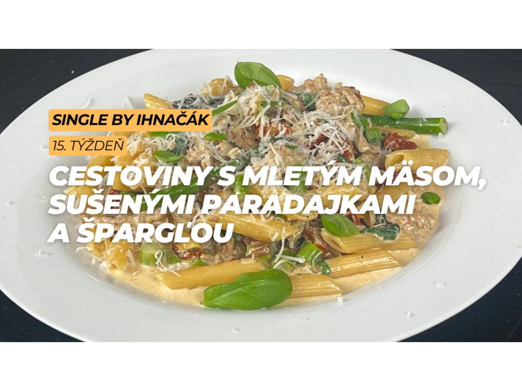 Cestoviny s mletým mäsom, sušenými paradajkami a špargľou (3. deň)